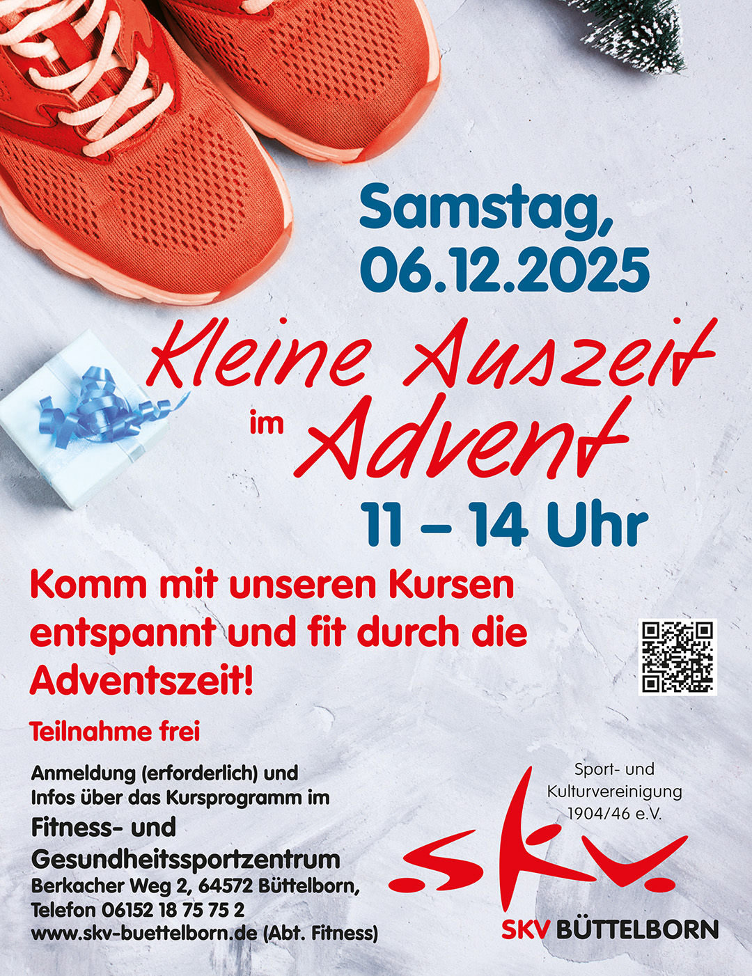 Unter dem Motto „Komm mit unseren Kursen entspannt und fit durch die Adventszeit“ bietet das Fitness- & Gesundheitssportzentrums der SKV Büttelborn am Samstag, 06. Dezember 2025 in der Zeit von 11:00 – 14:00 Uhr eine „Kleine Auszeit im Advent“ an.