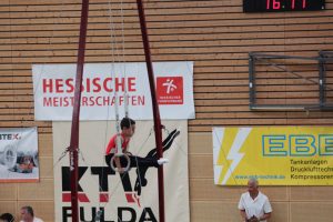 Am 07.05.2017 fanden in Fulda die hessischen Meisterschaften im Kunstturnen statt. Luan Aronica hat es geschafft im letzten Jahr ein dreimonatiges Probetraining am hessischen Turnleistungszentrum und Olympiastützpunkt Frankfurt am Main zu bestehen und hat nun dreimal wöchentlich dort Training. Zusätzlich besucht er montags die Turnstunde der SKV, was ein enormes Pensum für den 2009 geborenen Luan darstellt. Aber mit viel Ehrgeiz und Lust am Turnen schafft er es und die Resultate konnten sich bei den Meisterschaften zeigen. Der bisher für ihn gewohnte klassische 4-Kampf, der an „normalen“ Turnwettkämpfen geturnt wird, wurde durch den 6-Kampf ersetzt. Neben den Geräten Boden, Reck, Barren und Sprung werden Übungen an Ringen und Pauschenpferd (für den Nachwuchs der „Pilz“) gezeigt. Gefordert werden allerdings nicht die standardmäßigen Pflichtübungen der Stufen 1-10, sondern vorgeschriebene Elemente für eine entsprechende Altersklasse, die den bisherigen Leistungsstand des leistungssportlichen Nachwuchses zeigen und vergleichbar machen sollen. Gleichzeitig sollen sie auch Leistungsziele für den Tuner darstellen. Die AK-Übungen werden in Pflichtübungen und Kür unterteilt. Da Luan 2009 geboren ist, startete er in der Gruppe der Altersklasse 8 (AK8) Pflichtübungen. Den Weg nach Fulda trat Luan mit seiner Familie an sowie der Trainerin aus Frankfurt. Ein Trainingskollege von ihm startete ebenfalls in der selben Altersklasse. Insgesamt hatten die beiden nur vier Monate Zeit, sich auf den Wettkampf vorzubereiten und bei der Schwere der Übungen ist dies fast schon eine kleine Sensation.