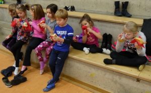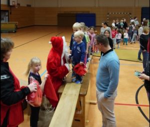 Drei Tage später fand die Weihnachtsfeier für die älteren Turnkinder statt. Auch hier konnte ausreichend getobt und in Mannschaftsspielen gegeneinander angetreten werden. Die Aktivitäten reichten über Brennball und „Bootsrennen“ bis hin zu Menschen-Memory und Zeitfangen. Am Ende konnten sich alle über ein Unentschieden freuen und belohnten sich mit heißen Würstchen. Auch bei den älteren Kindern schaute der Nikolaus vorbei und hatte für jeden ein Weihnachtsgeschenk mit im Gepäck.