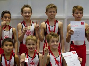 Am 02.12.2018 fanden die Hessischen Mannschaftsmeisterschaften im Kunstturnen in Biblis statt. Auch zwei Turner der SKV nahmen an dem Event teil und holten zusammen mit ihrer Mannschaft hervorragende Platzierungen. Luan Aronica und Jayden Lee durften sich über die Nominierung im Rahmen der Hessischen Mannschaftsmeisterschaften freuen, für die Mannschaft von Eintracht Frankfurt starten zu dürfen. In der Altersklasse 9/10 siegte die Mannschaft aus Frankfurt mit 148,60 Punkten vor dem Team der TSG Kassel-Niederzwehren. Damit darf sich Luan hessischer Meister mit der Mannschaft nennen!!