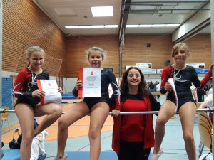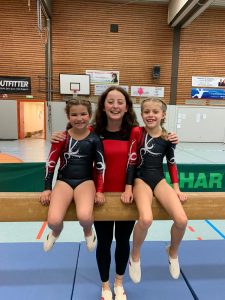 Bereits morgens um 8.00 Uhr waren Lena Szameit, Nike Kraft und Sophie Nold am Start. Sie turnten im WK 2 Jahrgang 2010 die Übungen P3 und am Sprung P4. Alle waren etwas aufgeregt, turnten aber ihre Übungen gut durch. Kleine Flüchtigkeitsfehler und eine Bodenberührung der Hand beim Balkenabgang (gilt leider als Sturz) verhinderten bessere Platzierungen. Aber alle drei hatten Platzierungen unter den besten 20 und waren damit sehr zufrieden: