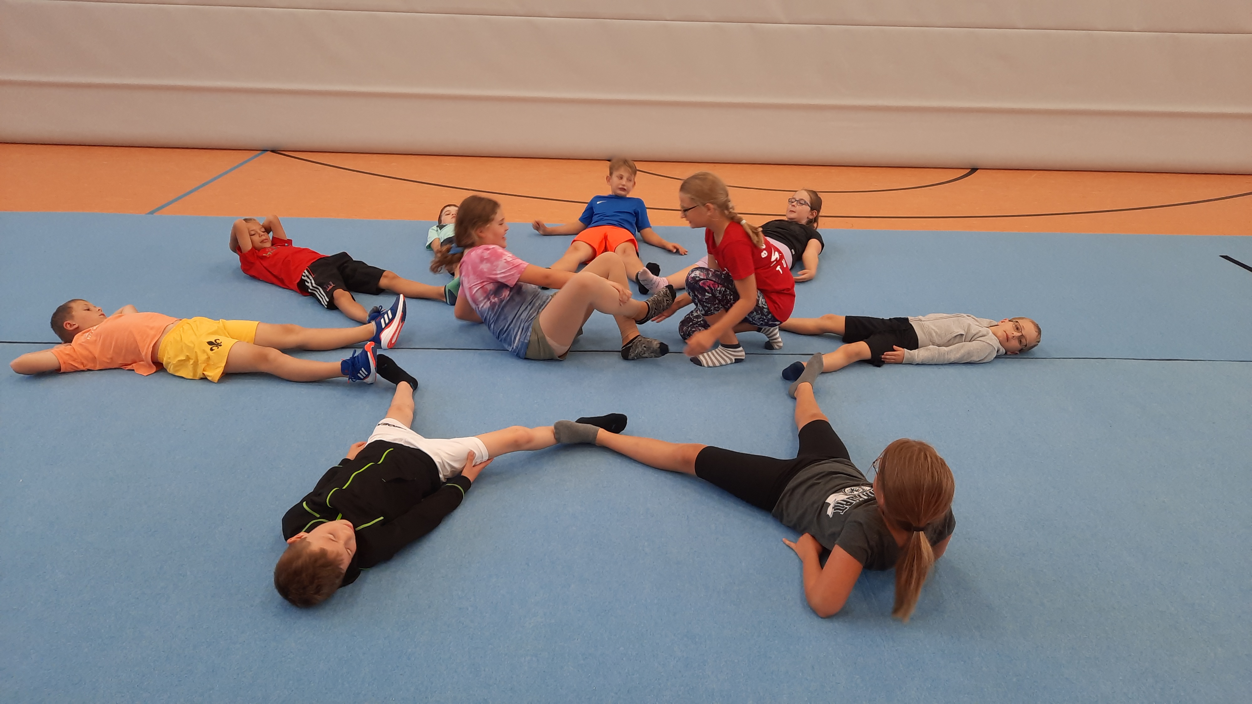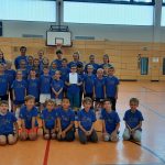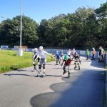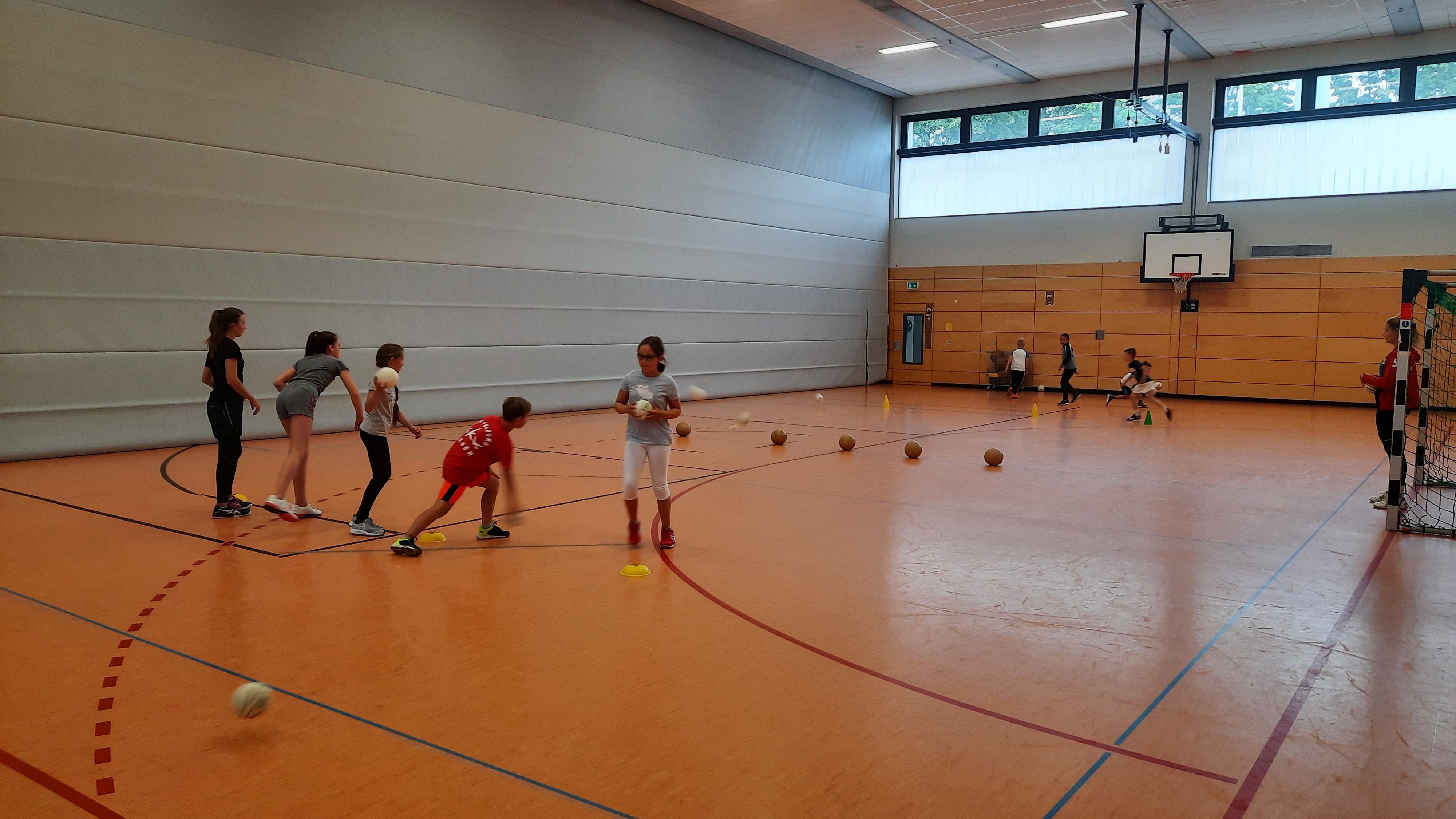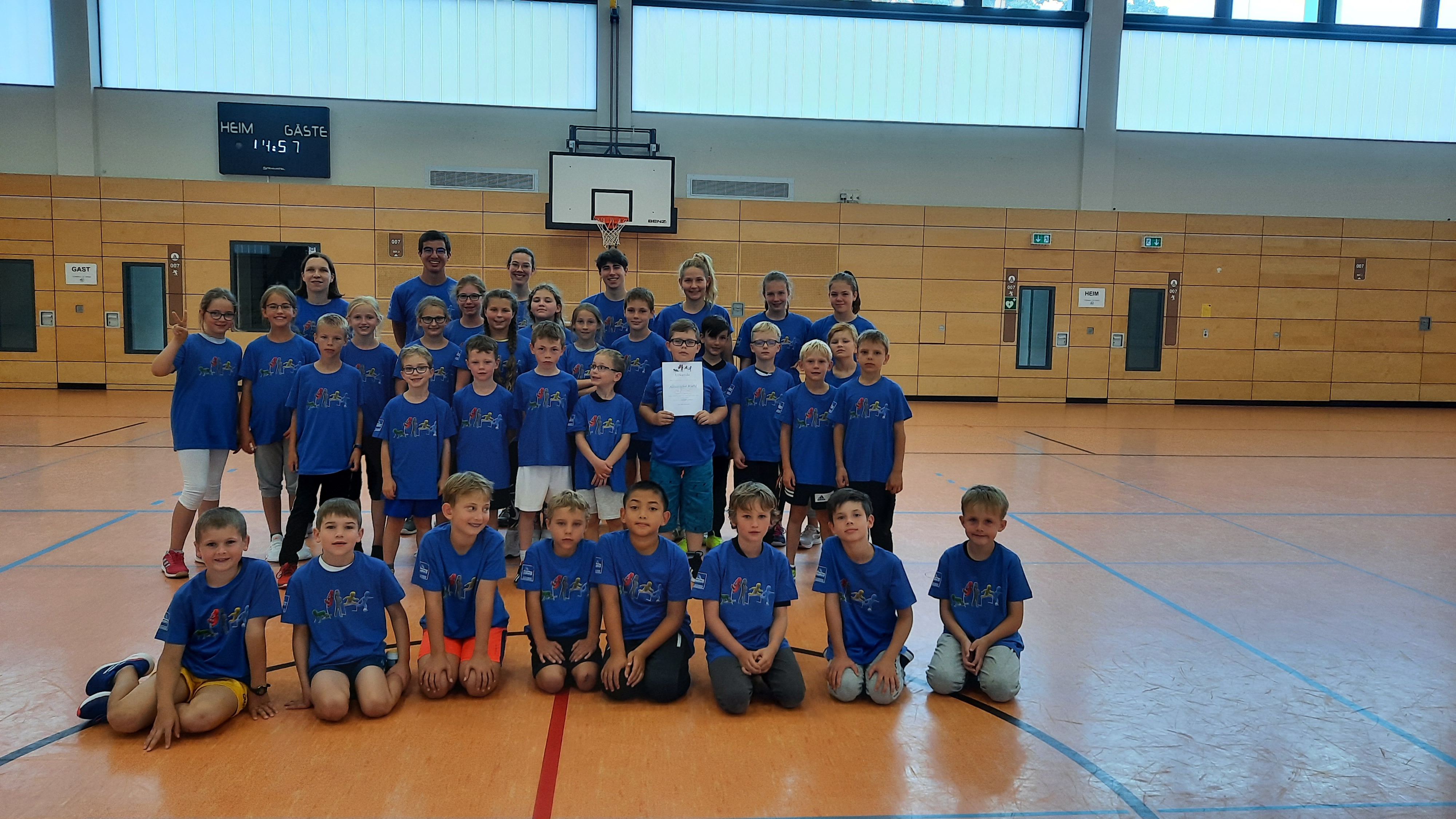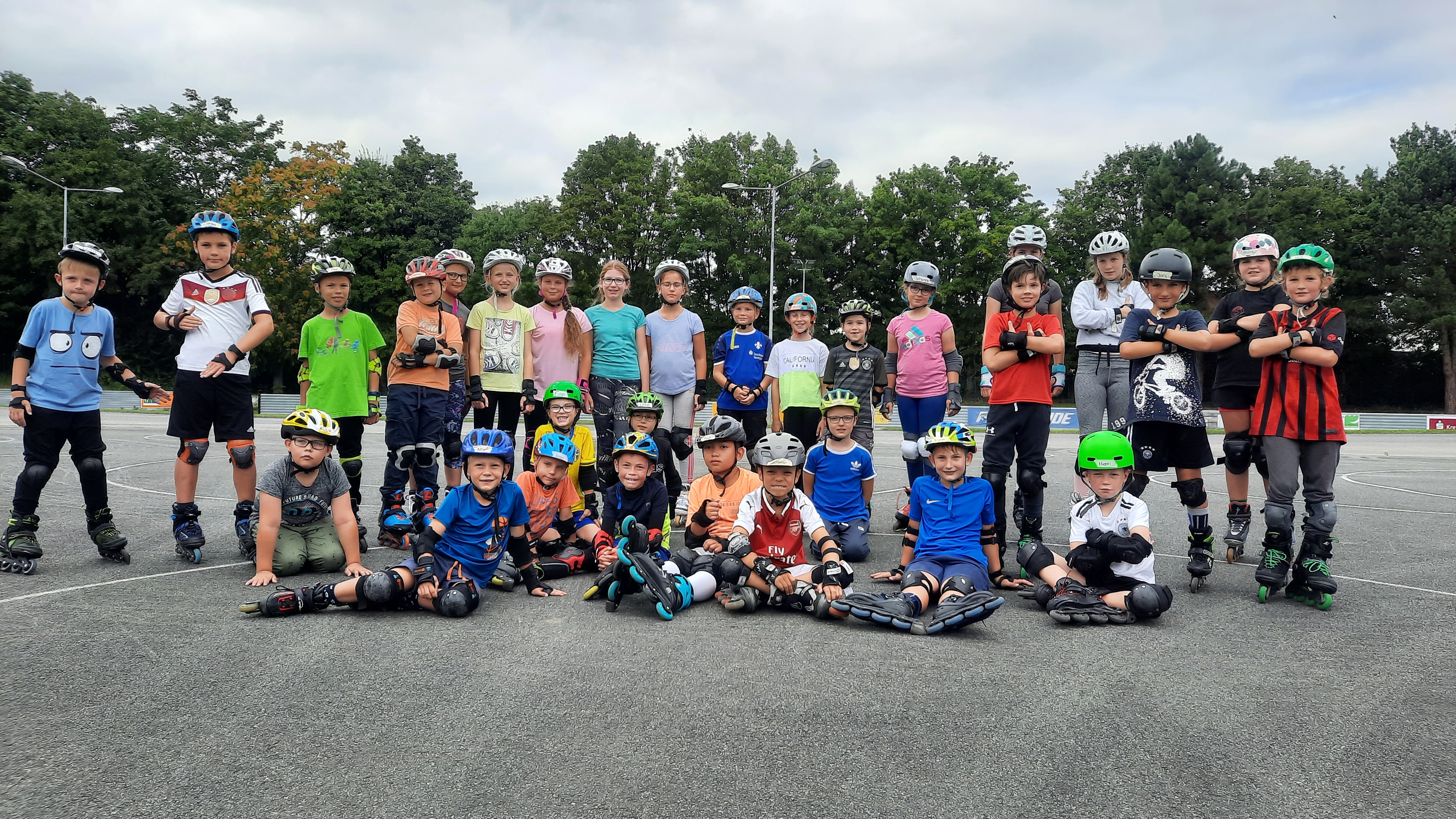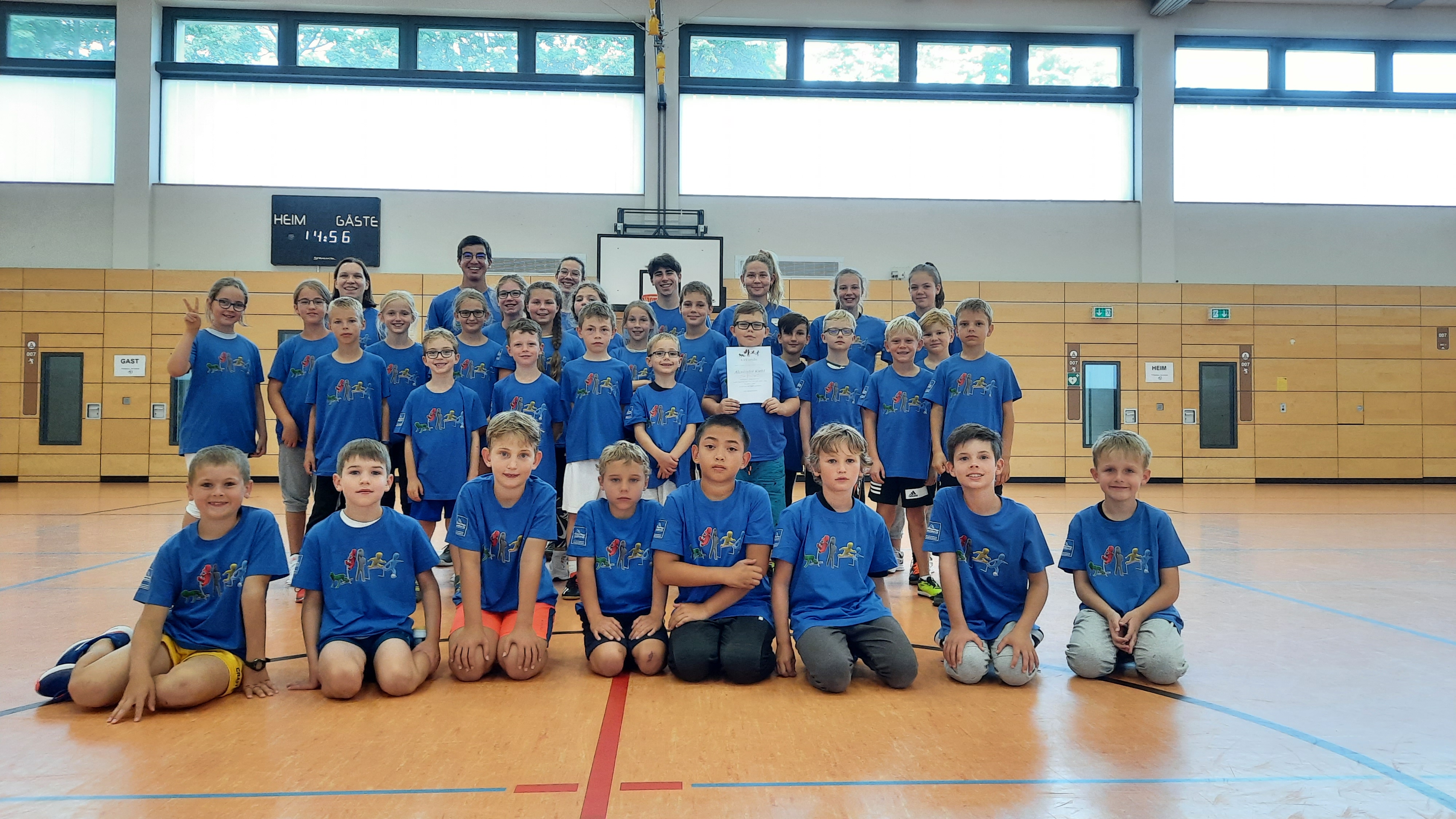 Der Montag stand klassisch unter dem Motto „Kennenlernen“ und so wurden mit verschiedenen Spielen erste Berührungsängste der Kinder untereinander abgebaut. Am Dienstag gab es schließlich ein Highlight der Woche statt – wir fuhren zur Speedskatinganlage von Blau-Gelb Groß-Gerau und die Kids hatten die Möglichkeit mit erfahrenen Trainerinnen ihre Technik zu verbessern oder überhaupt das „richtige“ Fahren auf acht Rollen zu erlernen. Am Mittwoch war Teamwork gefragt – vormittags mussten die Mädchen und Jungen ihr Talent beim „Trockensynchronschwimmen“ mit einer eigenen Choreografie unter Beweis stellen, ehe am Nachmittag beim Hindernisbrennball Geschicklichkeit gefragt war. Am Donnerstag folgte der mittlerweile obligatorische Tag auf der Tennisanlage wo Trainerin Alexandra Groß und ihr Team die Kids an die Sportart heranführte. Den Abschluss schließlich bildete am Freitagvormittag die Sportart HOLF, die sich aus den Begriffen Handball und Golf zusammensetzt. Wie beim Golf soll ein vorher festgelegtes Ziel (im HOLF-Sprachgebrauch ist dies das End-HOLF) mit möglichst wenigen Würfen mit einem Ball abgeworfen werden. Um die Herausforderung zu steigern, müssen auf dem Weg zum End-HOLF zwei Zwischenziele (Zwischen-HOLFs) getroffen werden. Wurde zuerst mit einer Videosequenz ein gewisses Grundverständnis der Sportart vermittelt, galt es im Anschluss mit verschieden Spielstationen diverse Wurftechniken zu üben ehe es dann ins tatsächliche HOLF-Spiel ging und die Kids auf dem Schulhof und dem nahegelegenen Spielplatz in vier Teams den Ball in selbst festgelegte Ziele bringen mussten. Am Nachmittag folgte zum Abschluss noch eine Einheit „Pyramidenspiel“ bei der die Kids und die Betreuer sich in verschiedensten Challenges gegenseitig herausfordern mussten um am Ende eine/n Sieger/in zu ermitteln. Müde und glücklich konnten dann nach Verleihung der Urkunden und der Überreichung der traditionellen Camp-T-Shirts die Kids an ihre Eltern übergeben werden. Wir freuen uns schon aufs nächste Jahr mit euch – notiert euch gerne schonmal den Termin 29. August bis 2. September 2022. Anmeldungen sind ab Anfang 2022 möglich.