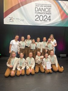 Zwei Wochen wurde nochmal intensiv trainiert und so ging es am 14.06.2024 los nach Wilsdruff. Die Aufregung war nicht nur bei den Tänzerinnen und Trainierinnen riesig, auch die mitgereisten Eltern fieberten mit. Die 16 besten Kinderformation aus ganz Deutschland, darunter auch vergangene Deutsche Meister sorgten für große Aufregung und die Erwartungen wurden klein gehalten – „Dabei sein ist alles“ war das Motto, denn dass es die Gruppe überhaupt soweit geschafft hatte überstieg alle Hoffnungen der Trainerinnen. Der große Wunsch war eine Runde weiterzukommen und vielleicht zweimal tanzen zu dürfen. Es war klar, dafür bedarf es Losglück, wann Ukiyo tanzen wird und eine ausdrucksstarke Darbietung. Beides traf ein, Ukiyo überzeugte mit einer großartigen Leistung und die Trainerinnen waren mehr als zufrieden. Wie immer rückte die Formationen ganz eng im Kreis zusammen, um die Verkündung zu hören, wer eine Runde weiterkommt. Nachdem 10 Formationen schon verkündet wurden, kam endlich die Erlösung – Ukiyo durfte an der Zwischenrunde von 12 Formationen teilnehmen.