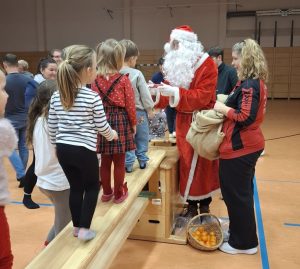 Zum Ende der Weihnachtsfeier schaute natürlich auch der Nikolaus bei den Kleinen vorbei. Mit einem prall gefüllten Sack betrat er die Sporthalle und brachte dieses Jahr sogar selbst ein Weihnachtsgedicht zum Besten. Danach bekam jedes Kind sein Weihnachtsgeschenk überreicht.