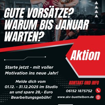 Nutzbar als Studiomitglied, über 10er-Karte oder als Gast gegen Gebühr (5,- Euro SKV-Mitglieder/10,- Euro Nichtmitglieder); daher keine Probeteilnahme möglich. Weitere Informationen telefonisch unter 06152/1875752.