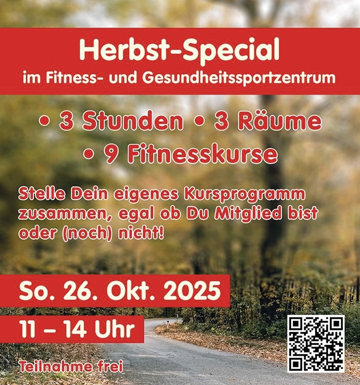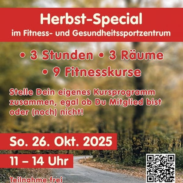 Am Sonntag, 26. Oktober 2025 veranstaltet das Fitness- & Gesundheitssportzentrum der SKV Büttelborn in der Zeit von 11:00 – 14:00 Uhr ein Herbst-Special unter dem Motto: