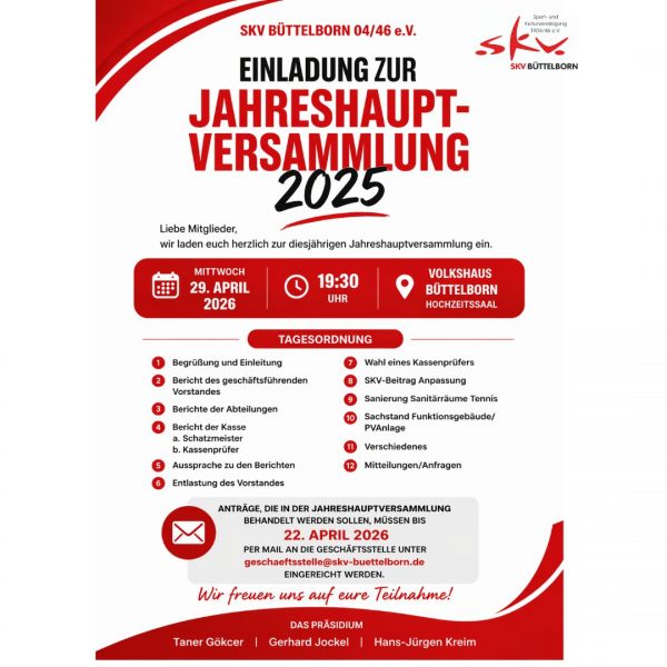 Anträge, die in der Jahreshauptversammlung behandelt werden sollen, müssen bis 22. April 2026 per Mail an die Geschäftsstelle unter geschaeftsstelle@skv-buettelborn.de eingereicht werden.