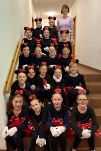 Und direkt nach der Pause brachten unsere 8- bis 10-jährigen Minnie Mäuse funkelnden Disney Glanz auf die Bühne. Auf anfangs langsame Musik wurde es mit Bändern und turnerischen Posen feierlich. Die Musik wurde dann flotter und die Bühne durch unsere Tücher bunter. Tanz und akrobatische Elemente wechselten sich ab und endeten in einem finalen Schlussbild.